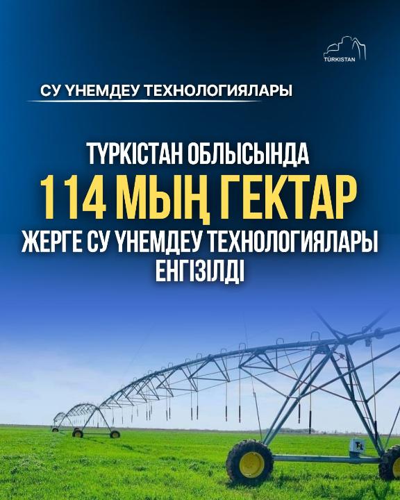 Түркістан облысында су ресурстарын тиімді пайдалану және ауыл шаруашылығы өнімділігін арттыру бағытында кешенді шаралар жүргізілуде. Бұл туралы Орталық коммуникациялар қызметінің баспасөз мәслихатында облыс әкімі Нұралхан Көшеров баяндады. Мемлекет басшысының тапсырмасына сәйкес өңірде заманауи су үнемдеу технологияларын жедел енгізу қолға алынған. Су үнемдейтін жүйелер ағын суды екі есеге дейін қысқартып, ауыл шаруашылығы дақылдарының өнімділігін үш есеге дейін арттыруға мүмкіндік береді. Түркістан облысы еліміздегі суармалы жерлердің төрттен біріне иелік ететін өңір болып есептеледі, суармалы алқаптардың жалпы көлемі 554 мың гектарды құрайды. Биылғы жылы 27 мың гектарға жаңа су үнемдеу технологиялары енгізілуі жоспарланып, барлығы 59 мың гектарға орнатылды. Осылайша, жоспар артығымен орындалып, облыста су үнемдеу технологиялары енгізілген жалпы жер көлемі 114 мың гектарға жетті.