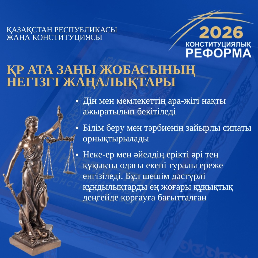 2026 жылға жоспарланған конституциялық реформа аясында Қазақстан Республикасының жаңа Конституциясы жобасының бірқатар маңызды жаңалықтары ұсынылды. Ата Заң жобасында мемлекеттің зайырлы сипаты нақты бекітіліп, дін мен мемлекеттің ара-жігі айқын ажыратылды.