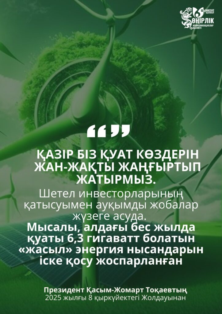Сонымен қатар Мемлекет басшысы қуат көздерін жан-жақты жаңғыртудың маңыздылығына тоқталды. Шетелдік инвесторлардың қатысуымен ауқымды жобалар іске асырылуда. Алдағы бес жыл ішінде қуаты 6,3 гигаватт болатын “жасыл” энергия нысандарын пайдалануға беру жоспарланған.