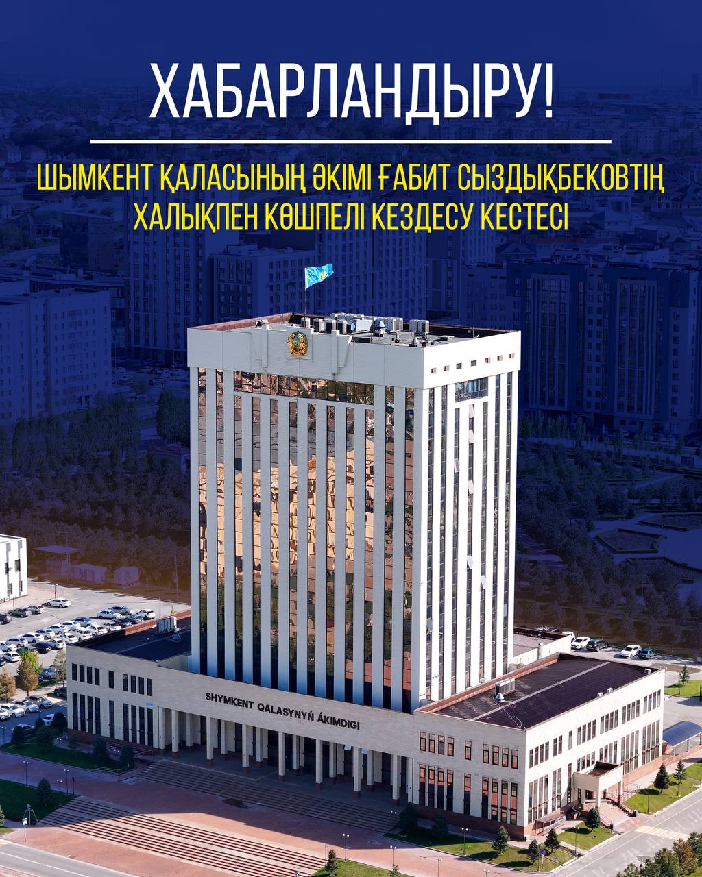 Мемлекет басшысының «Халық үніне құлақ асатын Үкімет» тұжырымдамасы аясында Шымкент қаласының әкімі Ғабит Сыздықбековтің 2025 жылы екінші тоқсандағы көшпелі кездесуі 16-20 маусым аралығында ұйымдастырылады.
